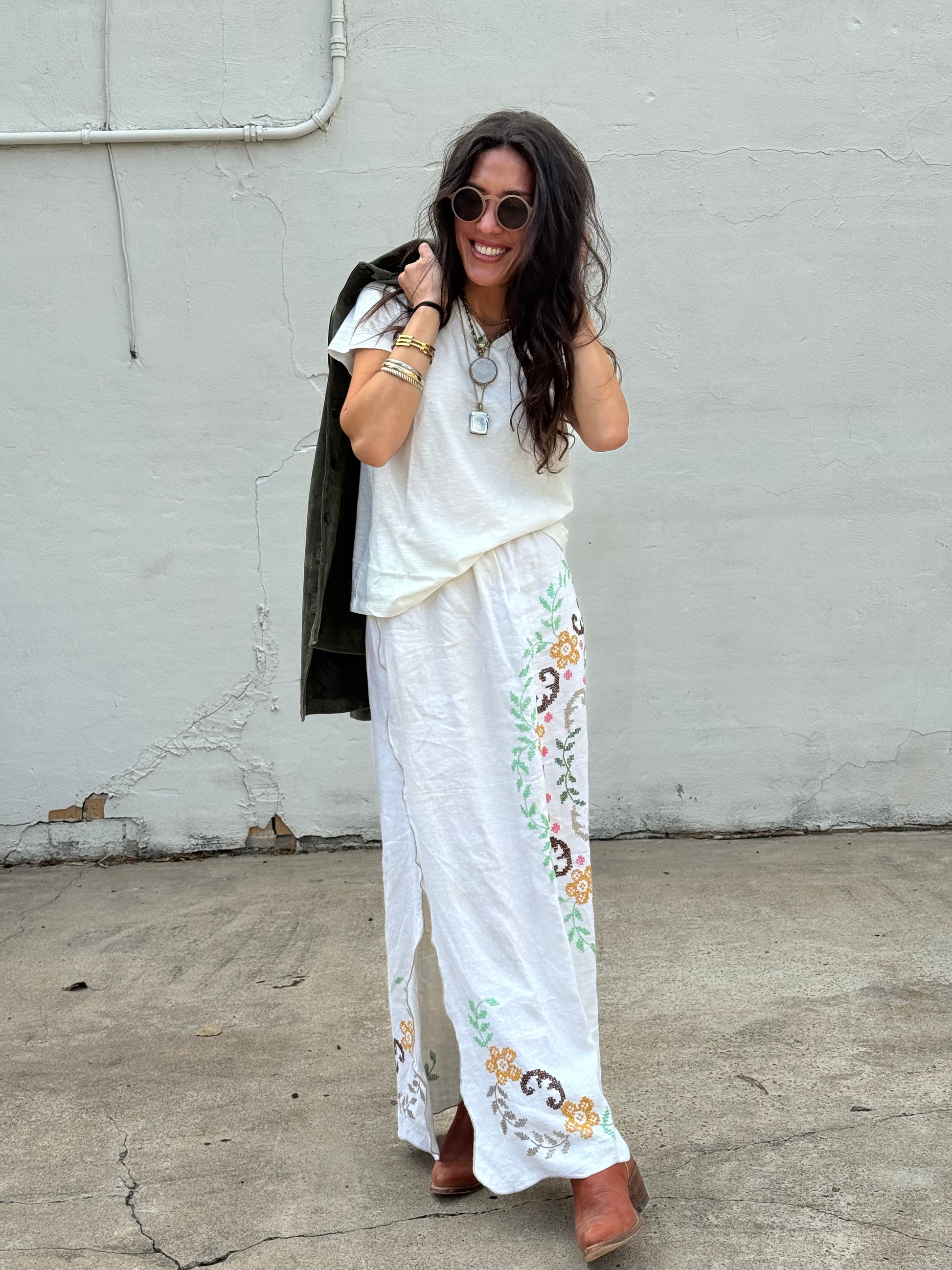 Vintage embroidered tablecloth skirt. Front/side slit and elastic waist. Cotton. Fits sizes S/M