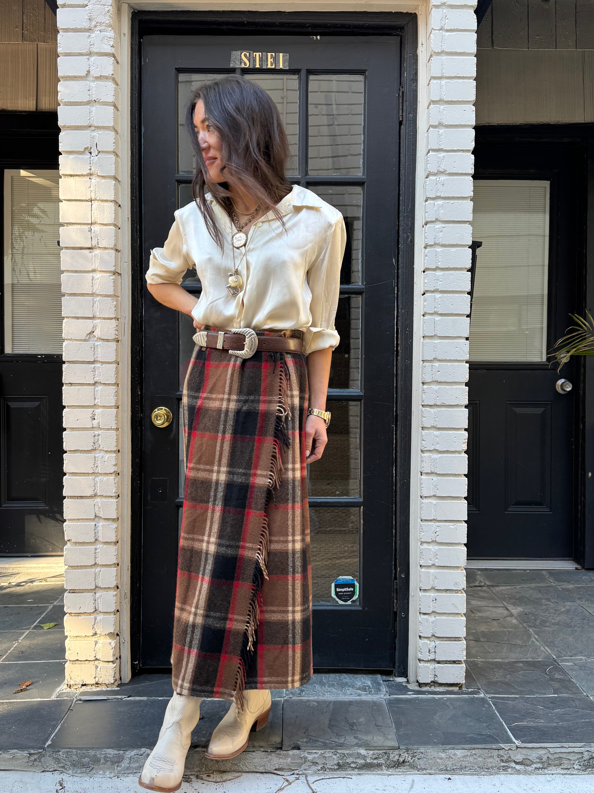 90s autumnal amazingness. Wool wrap skirt with fringe. Brown, tan, black. red.