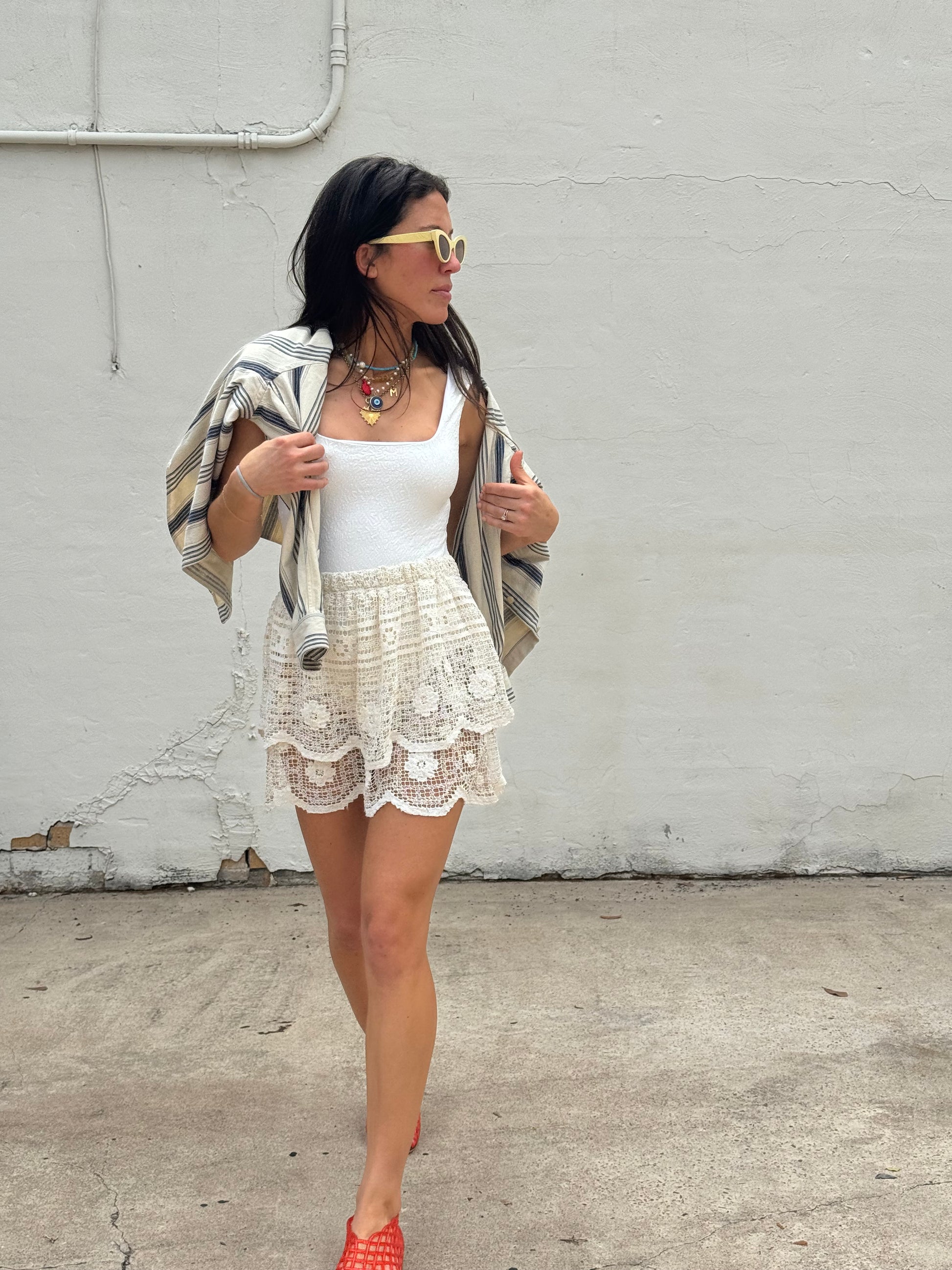 Double layer lace mini skirt made from vintage lace tablecloth. Fits most sizes S-L