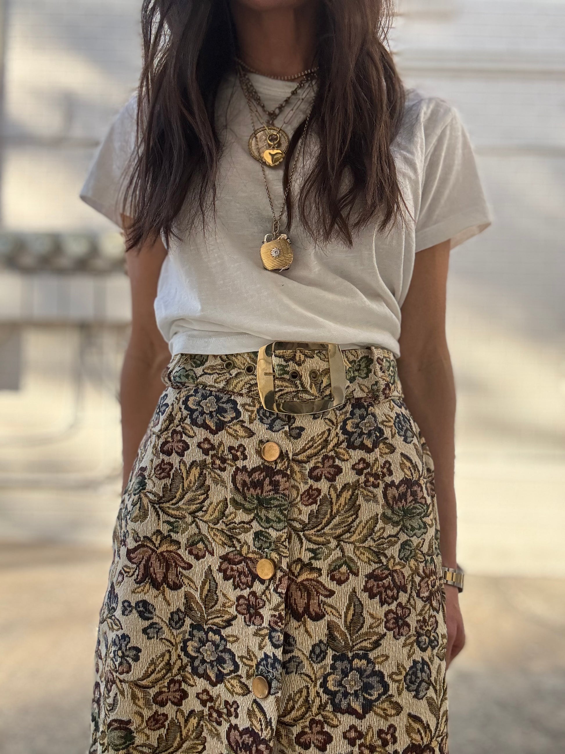 This skirt is a show stopper! 70s floral tapestry with button front and removable belt.