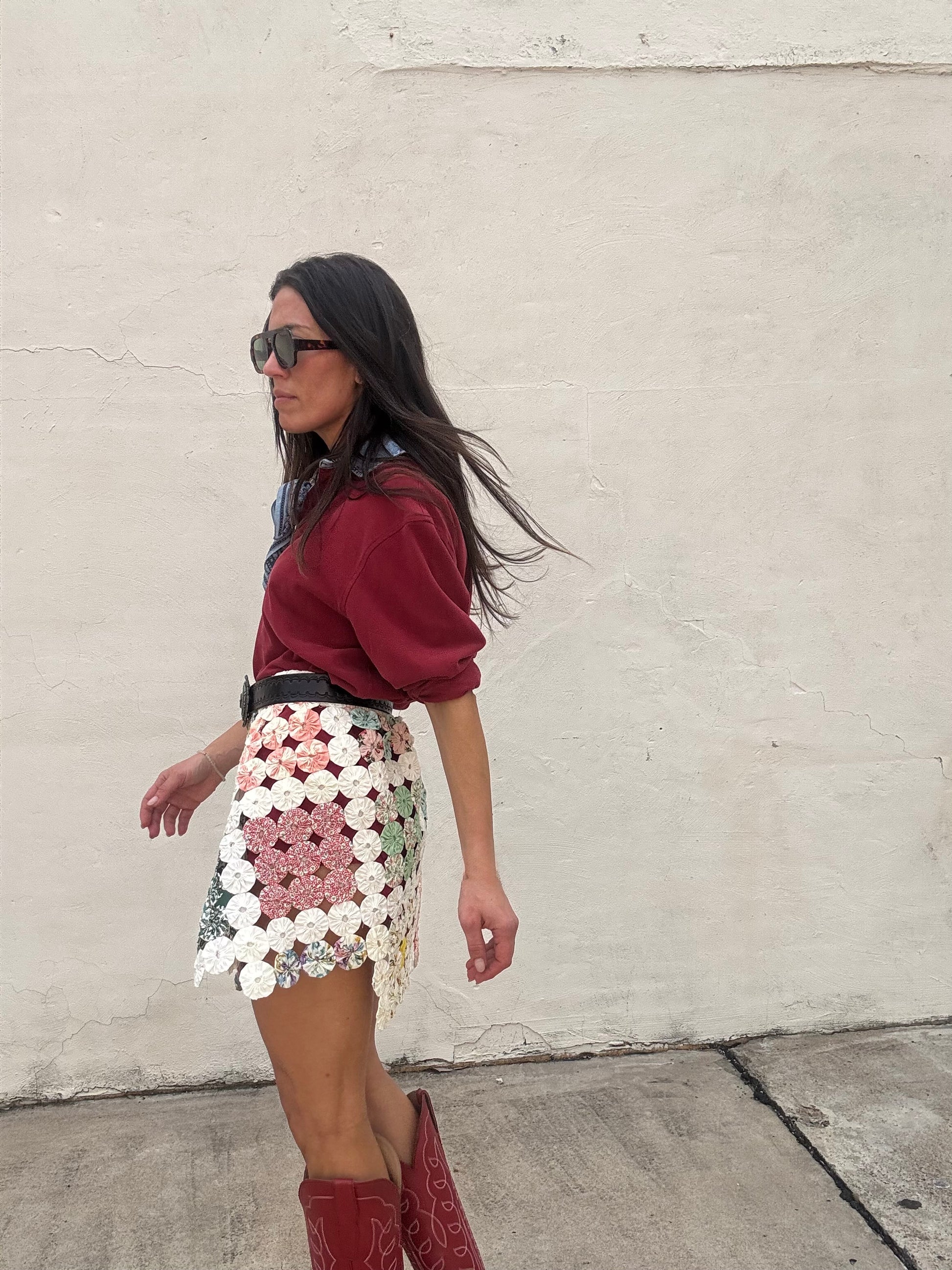 Yo-yo mini skirt in pastel shades with white squares. Asymmetrical hem. Size M/L