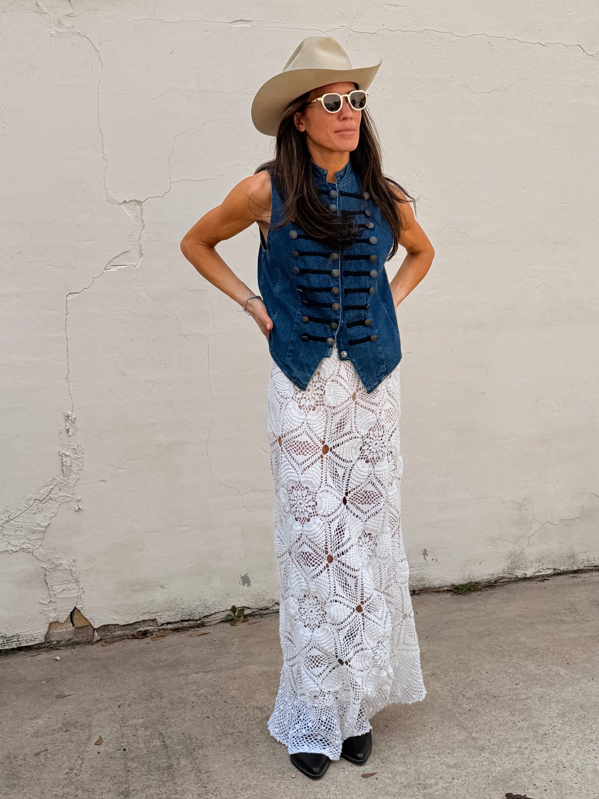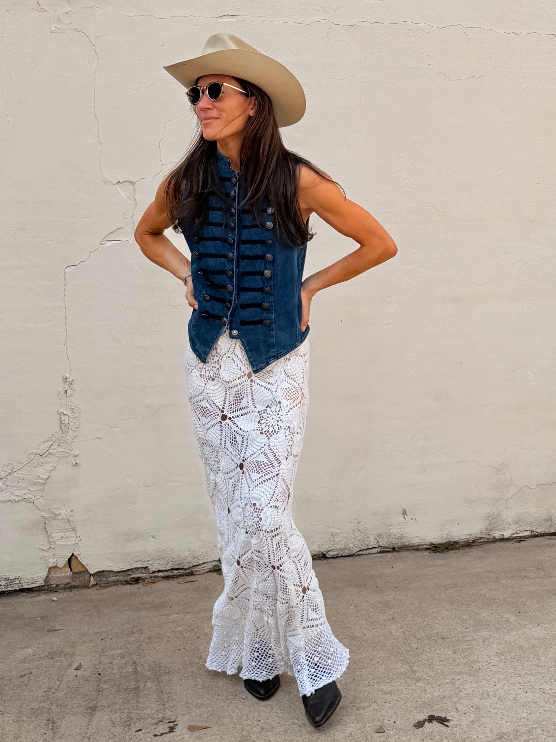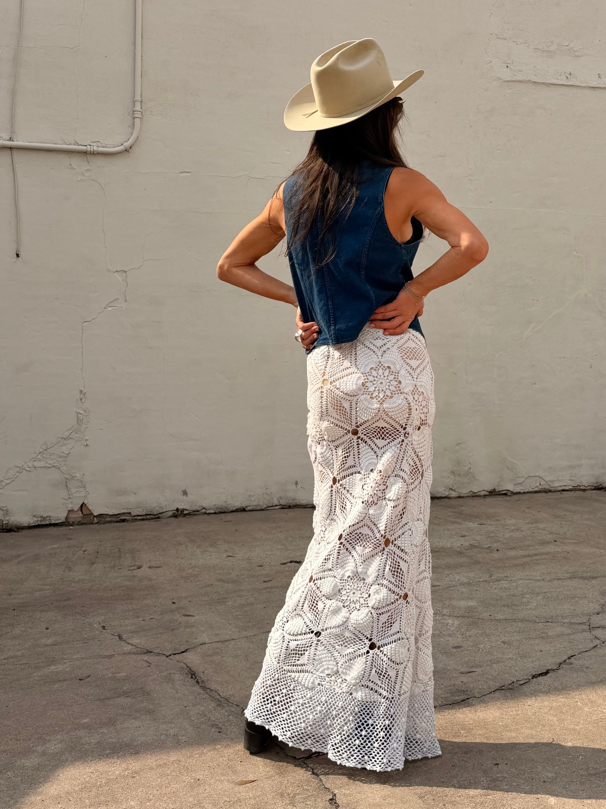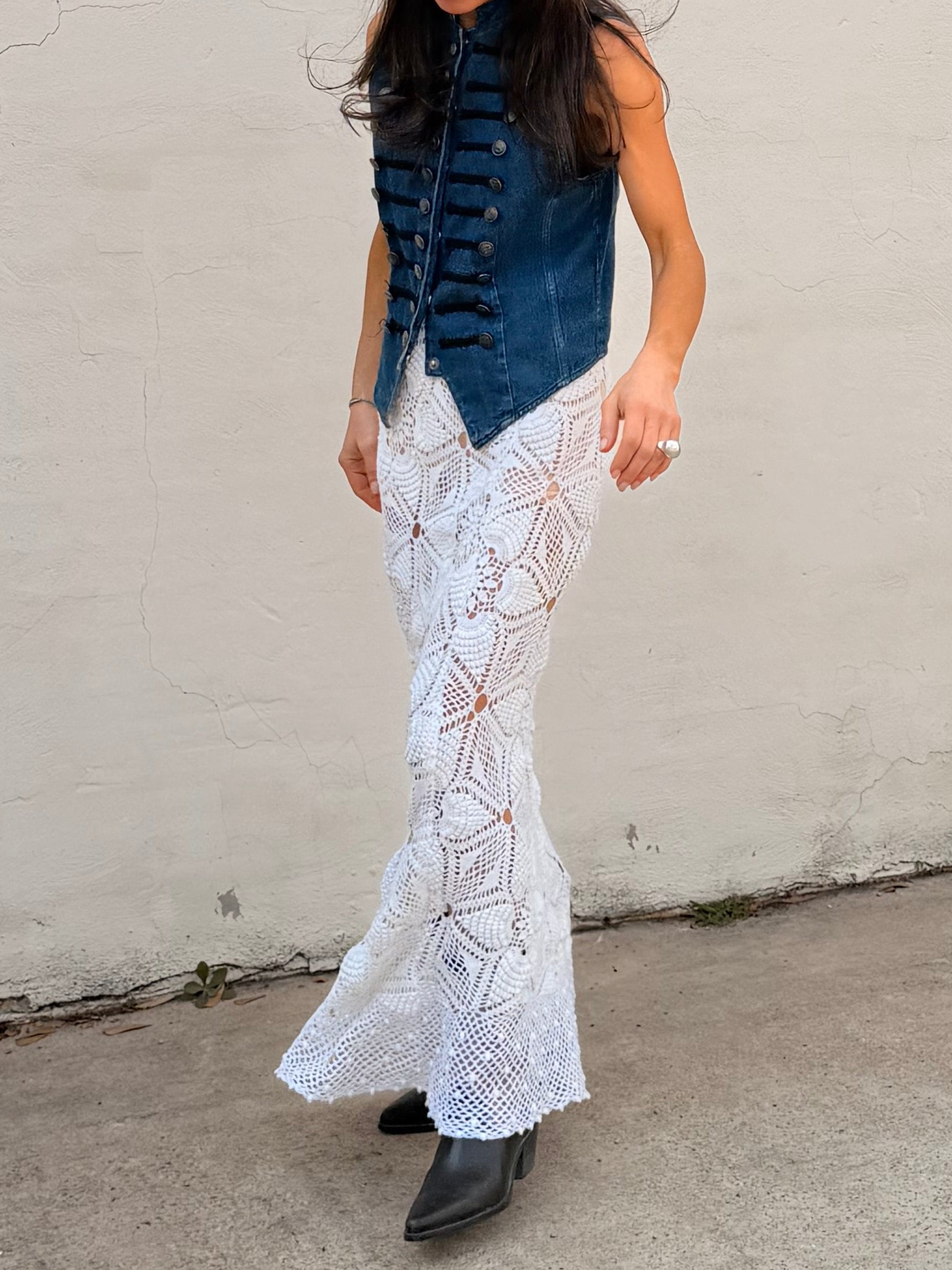 vintage crochet tablecloth reworked into maxi skirt. Has quite a bit of give. Forms to the body. Elastic waist