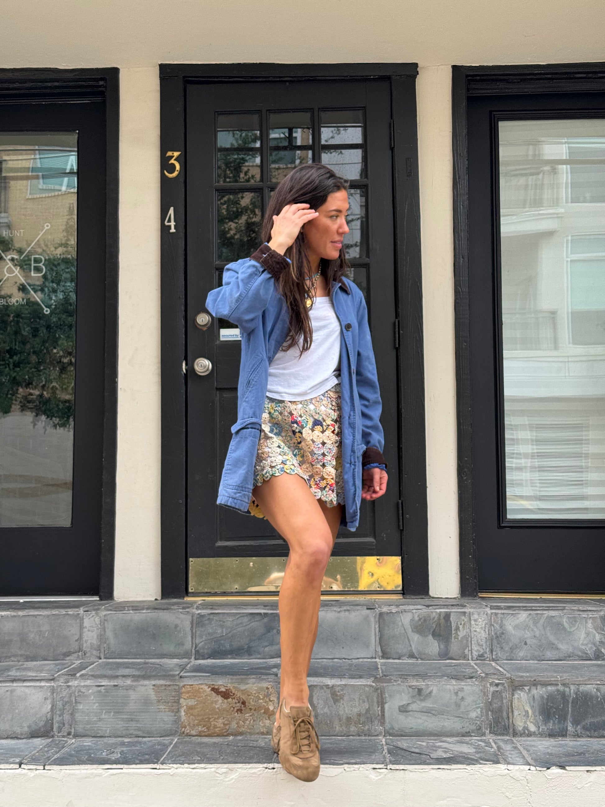 Mini skirt made from 1930s yo-yo quilt. Covered elastic waistband. Fits sizes S-L