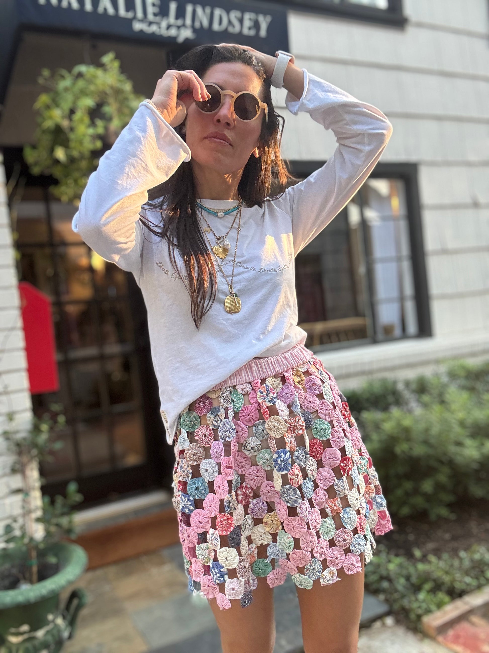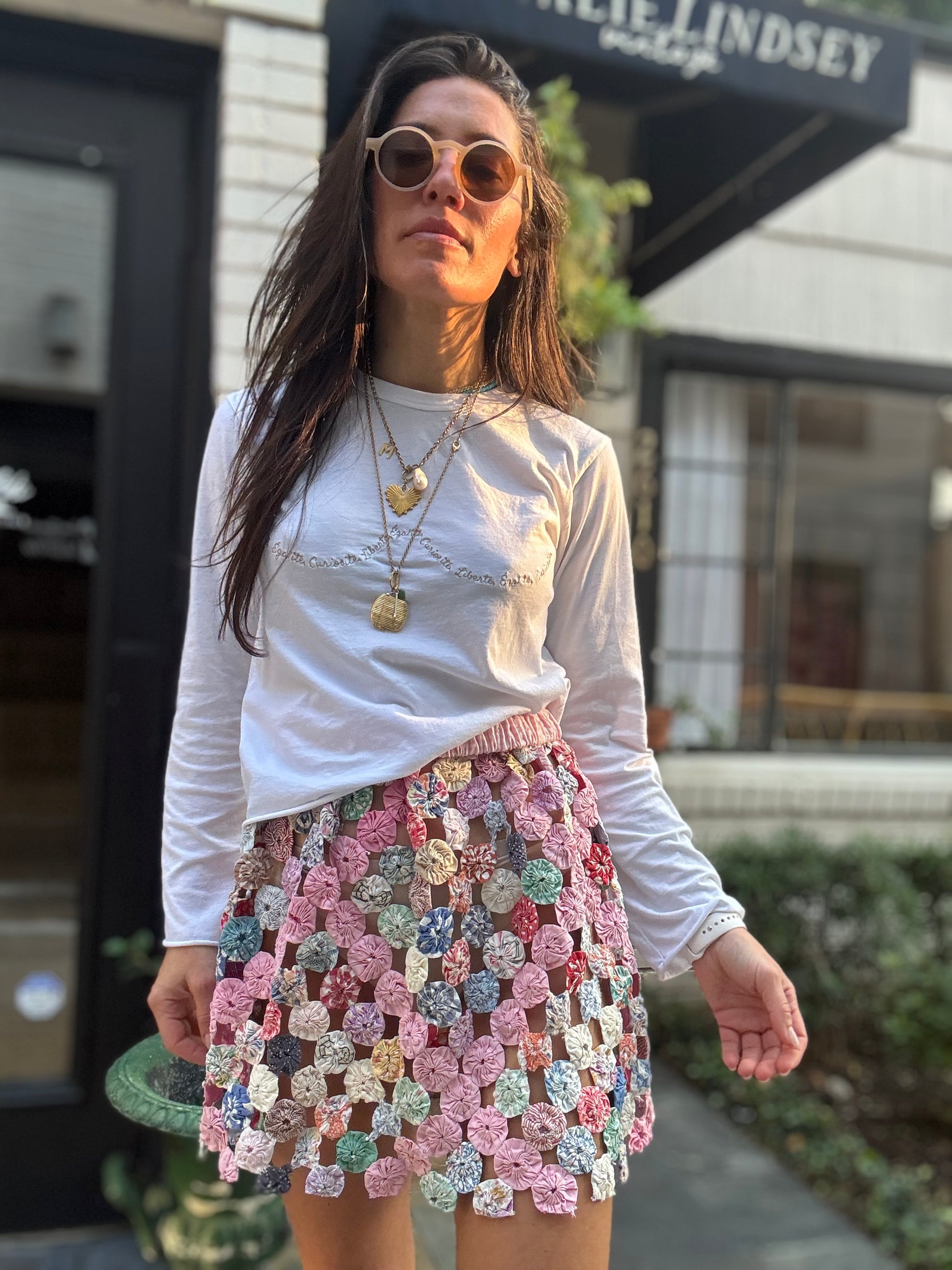 Yo-yo mini skirt reworked from pink 1940s quilt. Size M