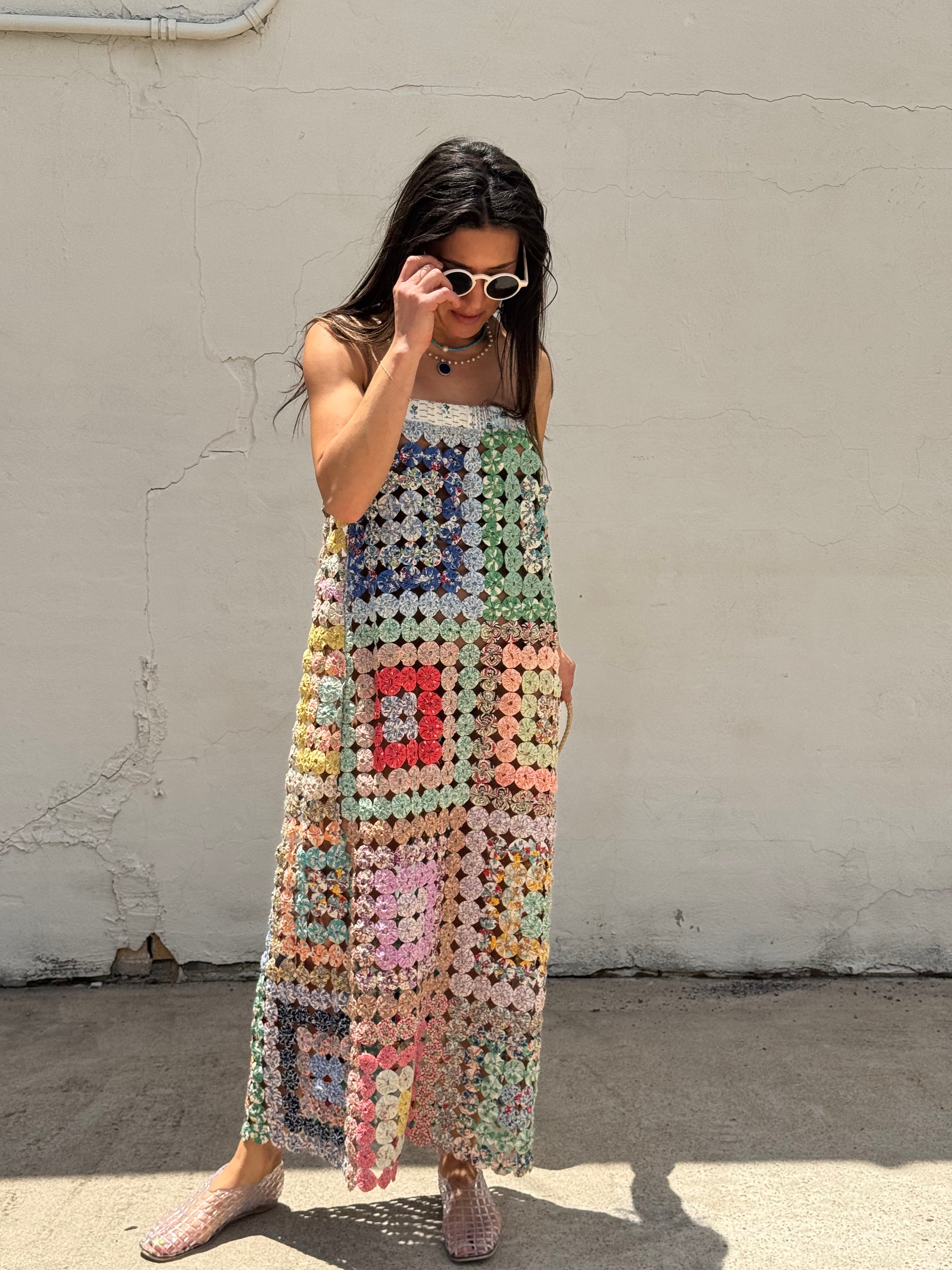 Strapless maxi dress mare from the most cheerful colored square pattern 1940s quilt. Elastic top. Ankle length. Once size fits most. Could also be worn as a skirt for larger sizes.