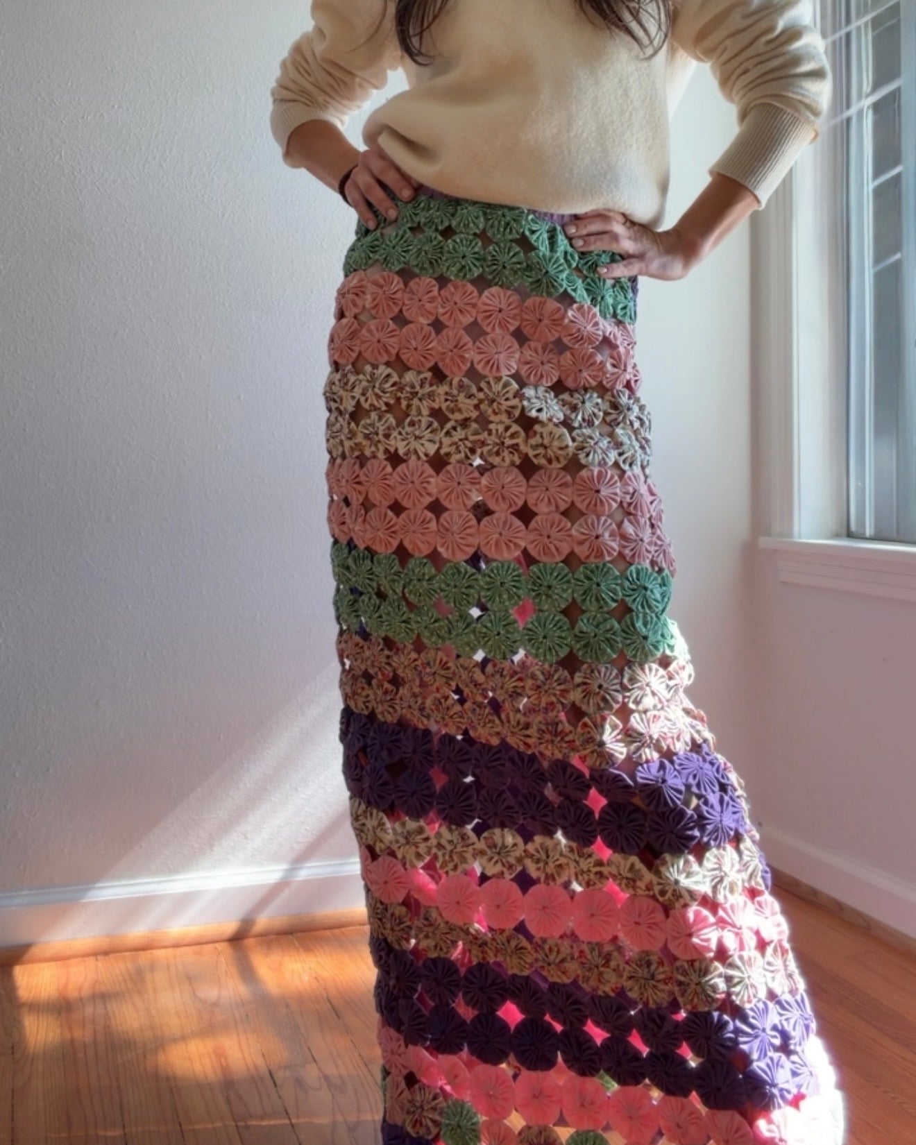 Yoyo maxi skirt in shades of pinks, purples and jade.